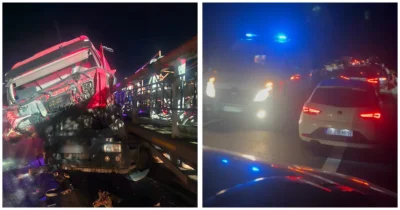 În zona kilometrului 81, pe același sens de mers, traficul se desfășoară îngreunat din cauza unui autotren care a intrat în coliziune cu parapetele marginal.