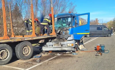 Impact devastator între două camioane! Un bărbat – încarcerat!