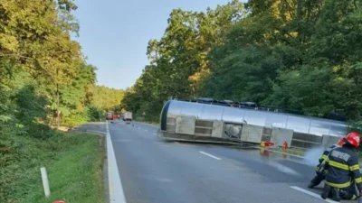 Acum! Accident înfiorător! Autocisternă plină cu combustibil răsturnată! Pericol de explozie, scurge...